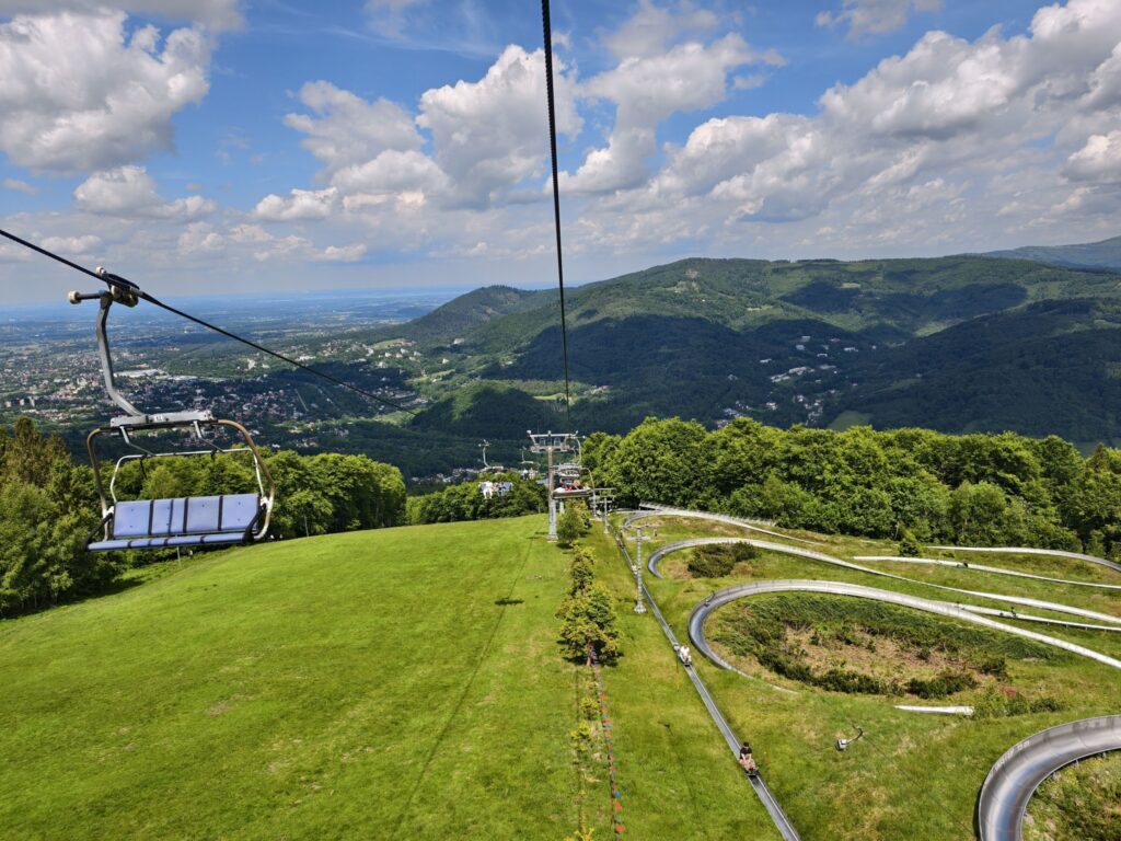 Zdobyły go, po czym padły w trawę wykończone drogą i upałem. Ale długo nie poleżały, skuszone sklepikami pamiątkowymi po czeskiej stronie. Poczyniwszy zapasy czekolady Studenckiej, zjechały kolejką w dół, z rozpędu obejrzały Wiślańską Niagarę, czyli sztuczny wodospad na Wisełce, skocznię narciarską i uzdrowisko Wisła.