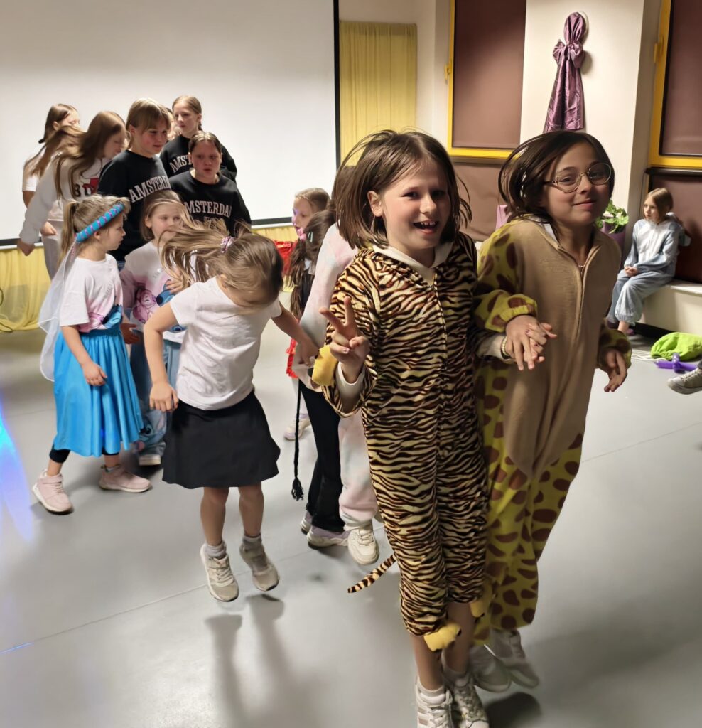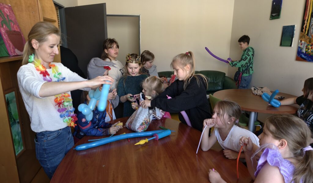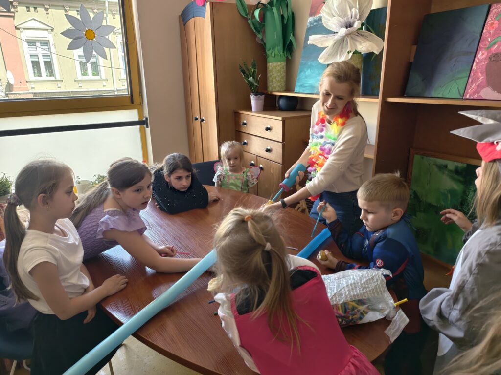 Pierwszą turę tańców odbyli w pokoju telewizyjnym. Potem była chwila odpoczynku w pokoju do zajęć plastycznych: dzieciaki malowały obrazki używając kredy pomieszanej z solą i wzięły udział w masowej produkcji zwierzątek oraz szabel z długich balonów.