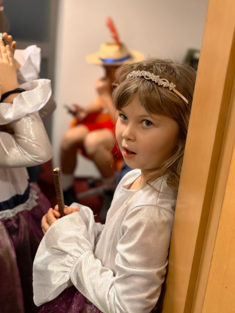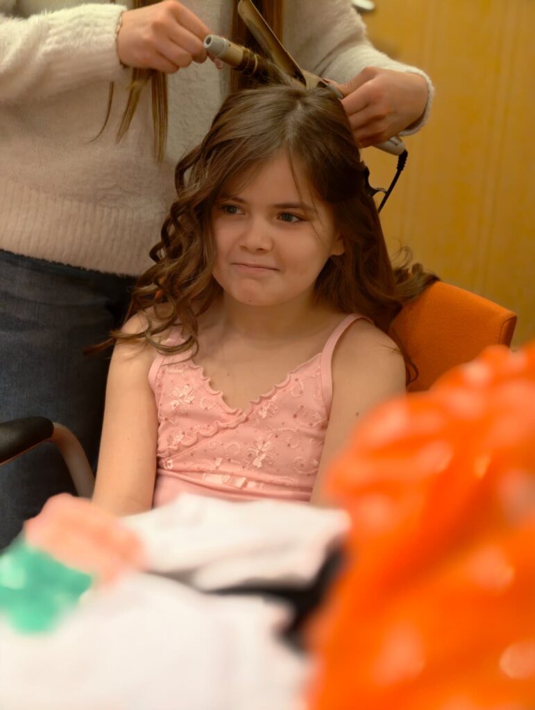 Pierwsza z brzegu mała garderoba zostaje zamieniona w zakład fryzjerski. Panie z TEB Edukacja po kolei łapią każdą przebiegającą dziewczynkę, sadzają w fotelu i dawaj rozgrzewać lokówki. Pinokio, Błękitna Wróżka i Świerszcz już są w kostiumach. Dołącza do nich Kuba w brązowym fartuchu stolarza – nasz pracownik socjalny i wychowawca świetlicy, jedyny dorosły w obsadzie, obsadzony w roli Gepetta.